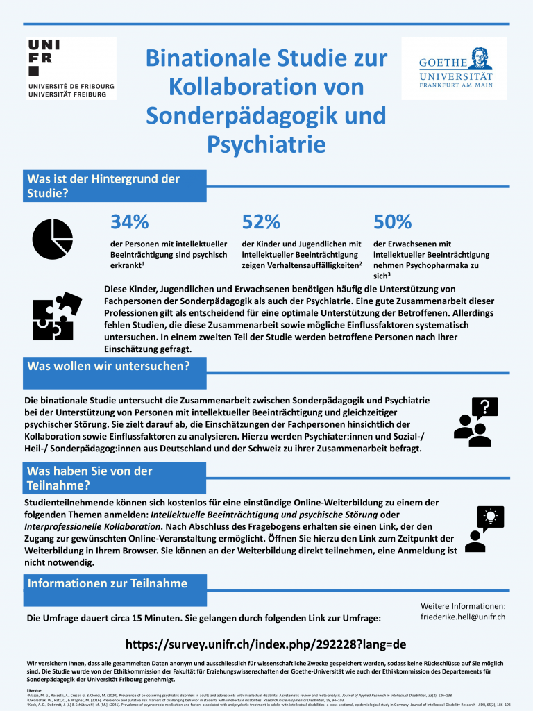 Im Rahmen einer binationalen Studie zwischen der Universität Fribourg (Schweiz) und der Goethe-Universität Frankfurt erforschen wir die Zusammenarbeit zwischen Fachkräften aus Sozial-/Heil-/Sonderpädagogik und Psychiatrie in der Betreuung von Menschen mit intellektueller Beeinträchtigung und psychischer Störung.