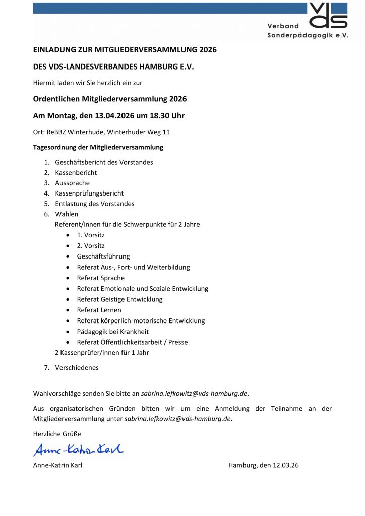 Home | Termine | MitgliederversammlungMitgliederversammlung13. April 2026DetailsDatum 13. April 2026Zeit 18:30 UhrMedien Vds Hamburg Einladung MV 13.04.2026 pdf (284 KB) Mitgliederversammlung () Termin teilen